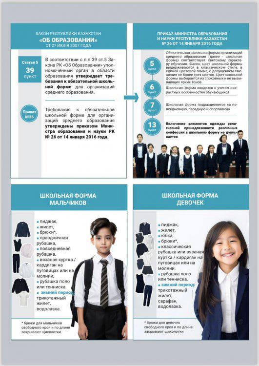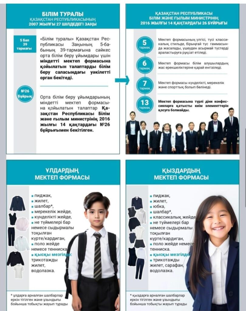 1. Міндетті мектеп формасына қойылатын талаптар ҚР БҒМ 14.01.2016 ж. №26 бұйрығымен регламенттелген. 2025-2026 оқу жылында қолданыстағы бұйрық басшылыққа алынады.